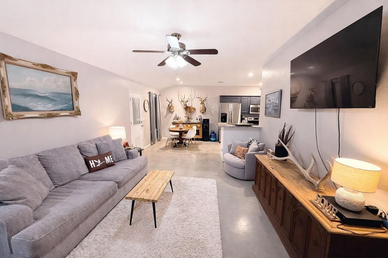 Beautifully maintained 3-bedroom, 2-bath home built in 2015, ideally located just minutes from town, top-rated schools, shopping, and dining. This inviting home features an open-concept living and dining area that flows seamlessly into a stylish galley kitchen equipped with stainless steel appliances. Durable stained concrete floors run throughout, offering both a modern look and easy maintenance.Step outside to a spacious, privacy-fenced backyard?perfect for relaxing, entertaining, or enjoying time with family and pets. Nestled on a quiet street, this home offers both comfort and convenience.Bonus: Oversized stainless steel washer and dryer convey with the property.