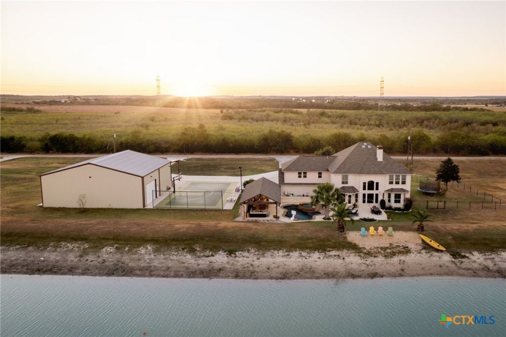 Ski Lake waterfront home in desirable Navarro ISD! Enjoy resort-style living with a custom swimming pool featuring an integrated hot tub, outdoor cabana with full kitchen, and a 40'x70' lighted multi-sport court for pickleball, tennis, volleyball, and basketball. The spacious home showcases lake views from multiple rooms, quartzite countertops, wood-look porcelain tile flooring, and recent upgrades including two new high-efficiency HVAC systems, hail-resistant roof, and smart home features. Entertain with ease in two separate game rooms, or relax by the wood-burning fireplace. Ample storage with a 50'x60' insulated workshop designed for RV, boat, and hot rod storage, plus a 3-car attached garage. This private, gated community offers walking trails and HOA-owned lake reserve land for endless recreation. Incredible views, premium amenities, and endless entertainment options make this property a rare opportunity just 10 minutes from San Marcos and New Braunfels, TX.